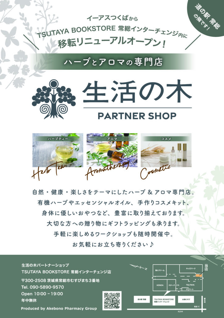 このたび、「生活の木パートナーショップ イーアスつくは店」は、2026年4月22日(水)より、「生活の木パートナーショップ TSUTAYA BOOKSTORE 常総インターチェンジ店」として、移転リニューアルオープンいたしました。